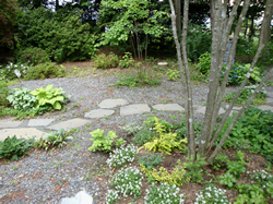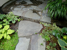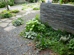 鉄平石の周りをグランドカバーがいい感じに覆っています