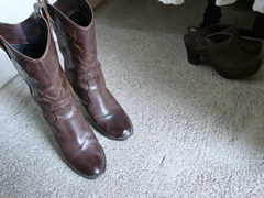 で、レギンスに ウエスタンブーツ