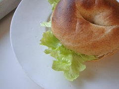 ベーグルは クリームチーズ、ハム、レタス、黒胡椒